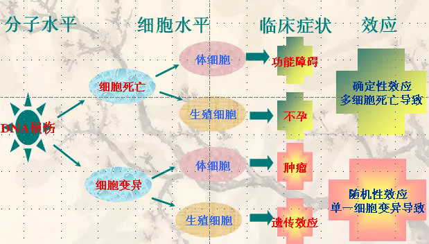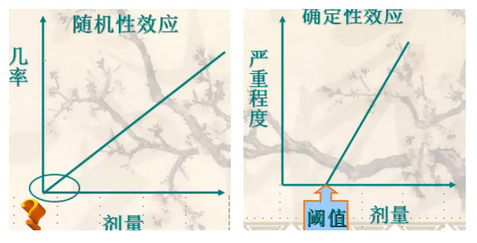 1.隨機性效應:無劑量閾值有害效應的嚴重程度與受照劑量大小無關(guān),任何微小的劑量也可引起效應,只是發(fā)生的幾率極其微小而已。如:致癌效應(癌癥 、白血?。?; 遺傳效應(損傷發(fā)生在具有遺傳信息的功能細胞上,發(fā)生的效應將顯現(xiàn)在受照者的后代身上)。
