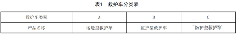 按產(chǎn)品功能和用途,將救護車分為3類,分類見表1。