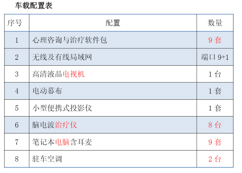3.1、框架式隔斷(方管骨架),將車廂分為檢查區(qū)、治療區(qū)2個區(qū)域。根據(jù)布局需要,安裝相應(yīng)的駐車空調(diào)(市電220V),配置相應(yīng)數(shù)量的五孔插座,配備相應(yīng)數(shù)量電腦,有線及無線局域網(wǎng)端口,心理咨詢、治療軟件包,以及腦電波治療儀。