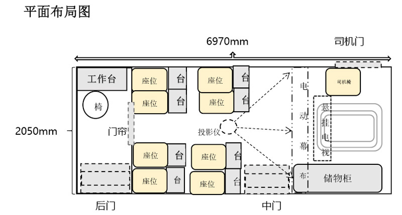 3.3、治療區(qū)布置:設(shè)置乘客椅8 張,司機椅1 張,乘客椅前置工作臺8 張,儲物柜1 個,懸掛高清電視機1 套,電動幕布1 套,便攜式投影儀1 套。